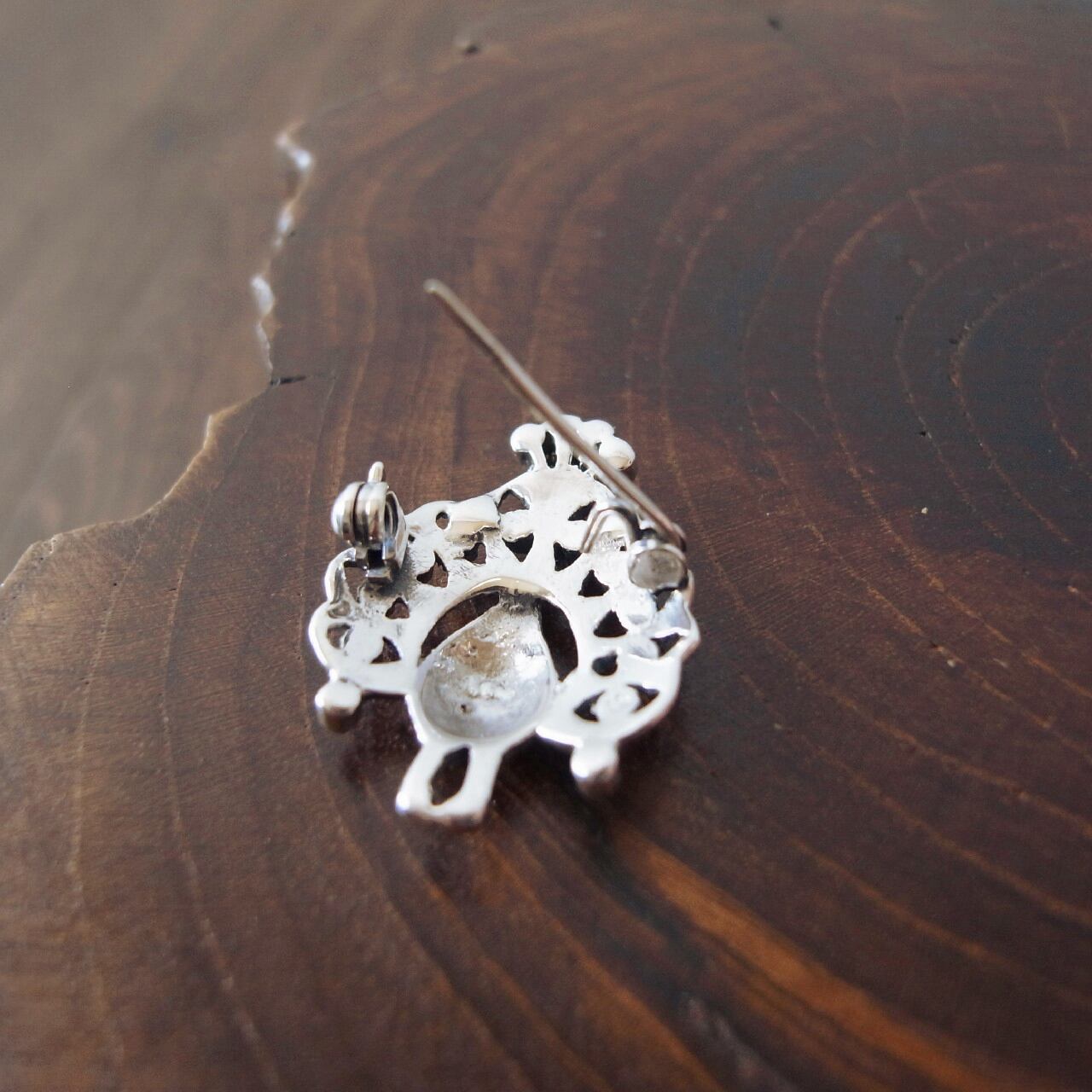 銀製品は空気中の硫黄物質などにより黒ずんできますが、市販の銀磨きクロスでお手入れして頂くと輝きがよみがえります。その際、石を避けて優しく磨いていただくと石へのダメージや破損防止になり長くご愛用いただけると思います。天然石は薬品・研磨剤・日光などからダメージを受けやすいものです。注意して大切に保管してください。液体クリーナーでのお手入れはお避け下さい