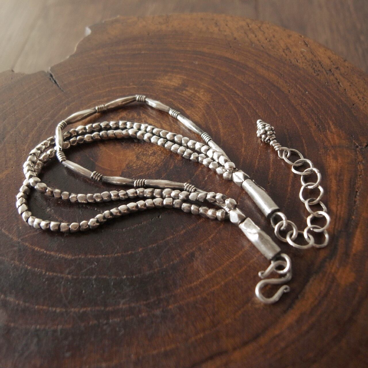 銀製品は空気中の硫黄物質などにより黒ずんできますが、市販の銀磨きクロスでお手入れして頂くと輝きがよみがえります。ブレスレットは強く引っ張ったり強い力で磨くと破損しますのでメンテナンスは優しく行ってください
