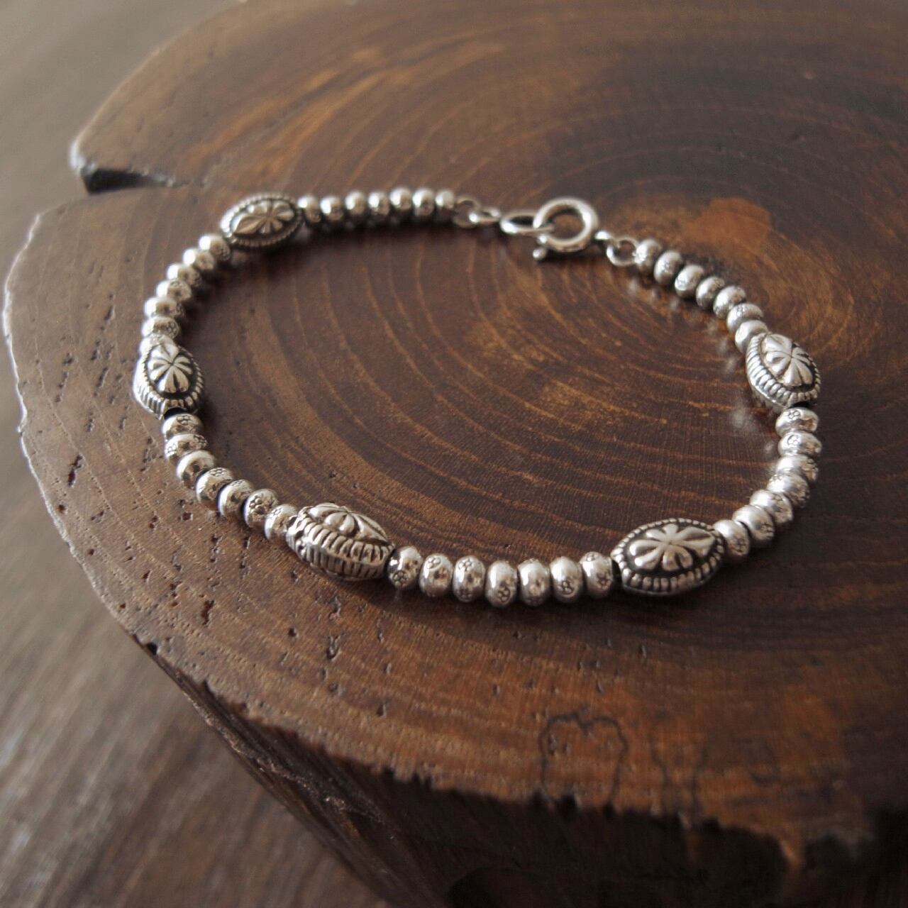 銀製品は空気中の硫黄物質などにより黒ずんできますが、市販の銀磨きクロスでお手入れして頂くと輝きがよみがえります。ブレスレットは強く引っ張ったり強い力で磨くと破損しますのでメンテナンスは優しく行ってください