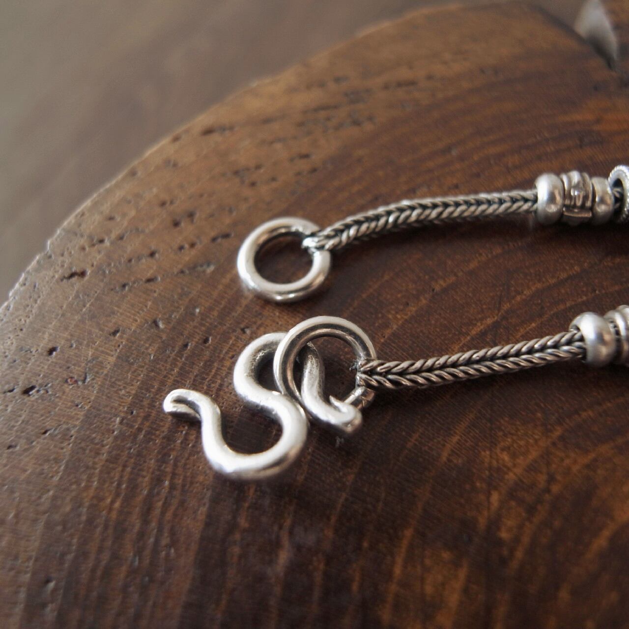 銀製品は空気中の硫黄物質などにより黒ずんできますが、市販の銀磨きクロスでお手入れして頂くと輝きがよみがえります。ブレスレットは強く引っ張ったり強い力で磨くと破損しますのでメンテナンスは優しく行ってください