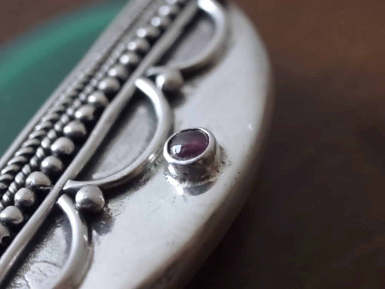 銀製品は空気中の硫黄物質などにより黒ずんできますが、市販の銀磨きクロスでお手入れして頂くと輝きがよみがえります。その際、石を避けて優しく磨いていただくと石へのダメージや破損防止になり長くご愛用いただけると思います。天然石は薬品・研磨剤・日光などからダメージを受けやすいものです。注意して大切に保管してください。液体クリーナーでのお手入れはお避け下さい
