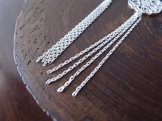 銀製品は空気中の硫黄物質などにより黒ずんできます。こちらは銀の白さと繊細な細工を魅力にしていますので液体クリーナーでのお手入れをおススメします。銀磨きクロスでのお手入れは破損のリスクがございますのでお避け下さい